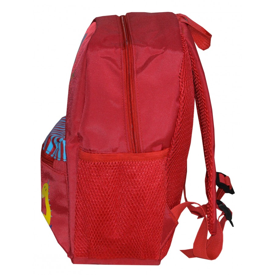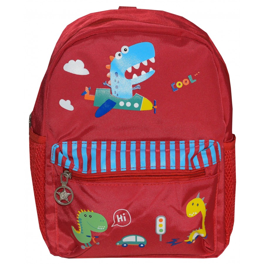 Детска раница за момче в червено с апликация динозаври. Модела е с едно голямо отделение, два странични джоба и малък преден джоб с цип.