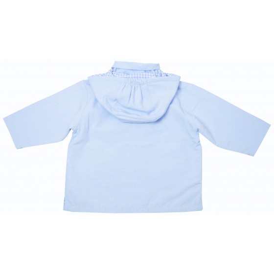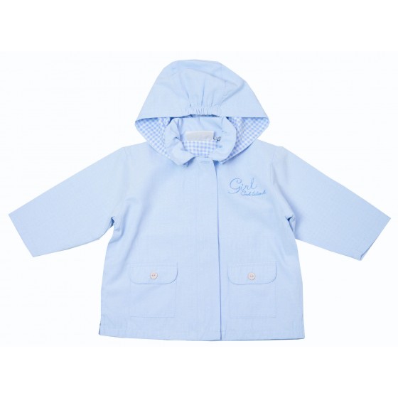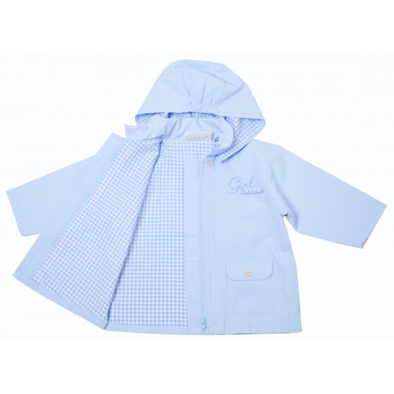 Бебешко пролетно яке за момиче в небесносиньо с качулка и каре подплата.
