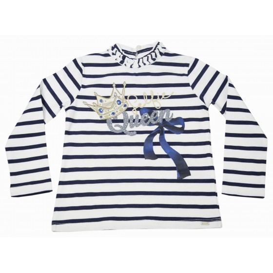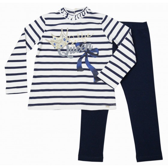 Детски комплект за момиче от две части. Блузата е в бяло и тъмносиньо райе с красива апликация. Клина е изчистен в тъмносиньо.