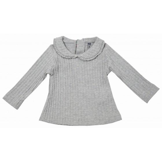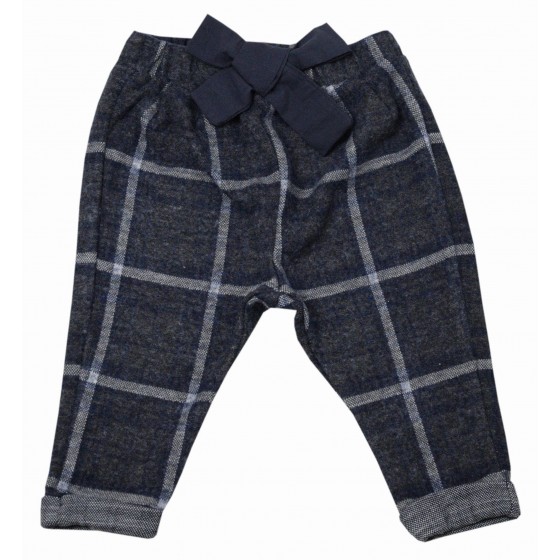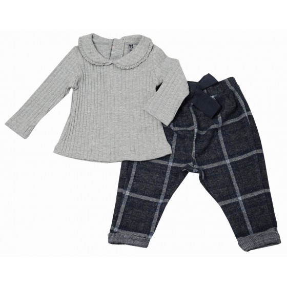Бебешки комплект за момиче от две части със сива рипсена блуза и каре панталон с панделка.