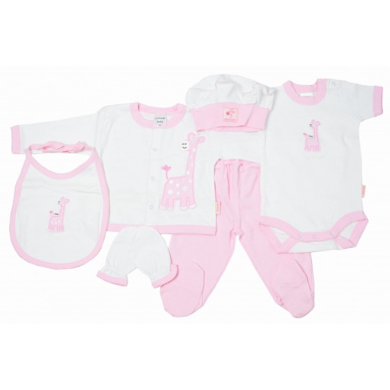 Бебешки комплект за момиче от 6 части с жилетка, боди, ританки, шапка, ръкавички и лигавник.