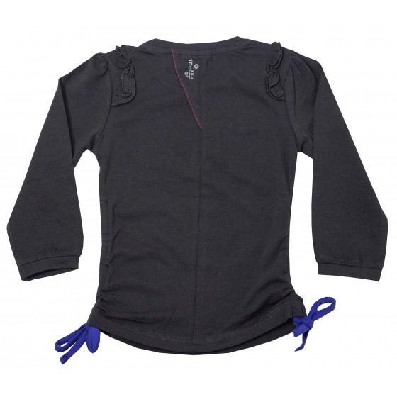 Бебешка блуза за момиче в сиво, набрана острани и с апликация надписи.