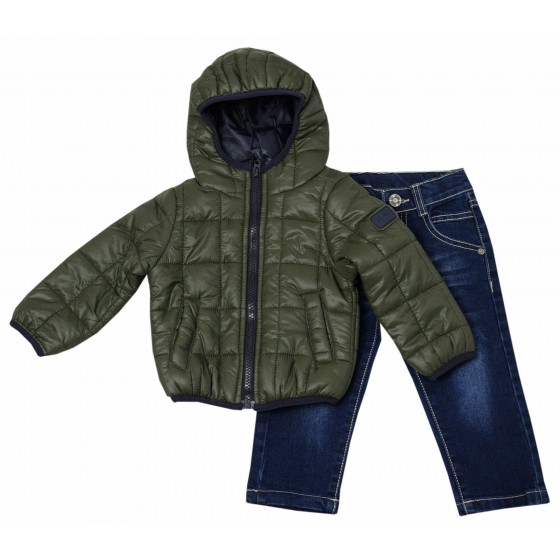 Бебешки комплект за момче от две части със зелено есенно яке и тъмносини дънки.