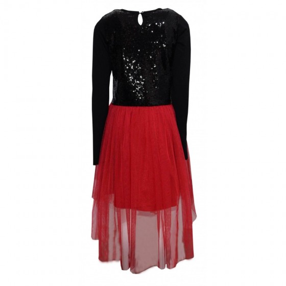 Детска рокля в черно с пайети и червен тюл Breeze. Модела е с удължен тюл на гърба и пайети.