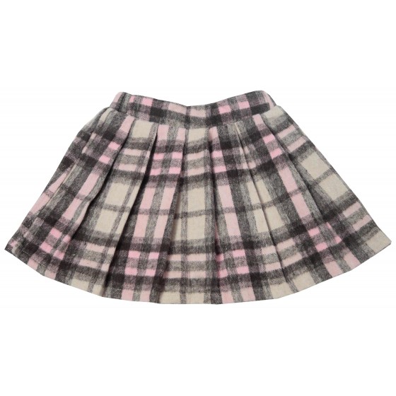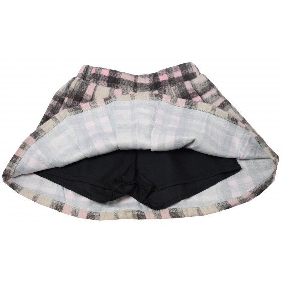 Детска пола в розово и бежово каре. Модела от вътрешната страна е с пришити къси панталони в черно.