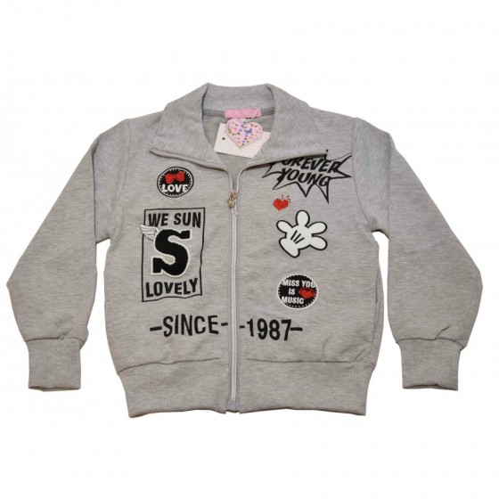 Детски комплект за момиче в сиво меланж Cichlid. Суитшърта е с апликация напръскан ефект. Долнището е с ластик на глезените.