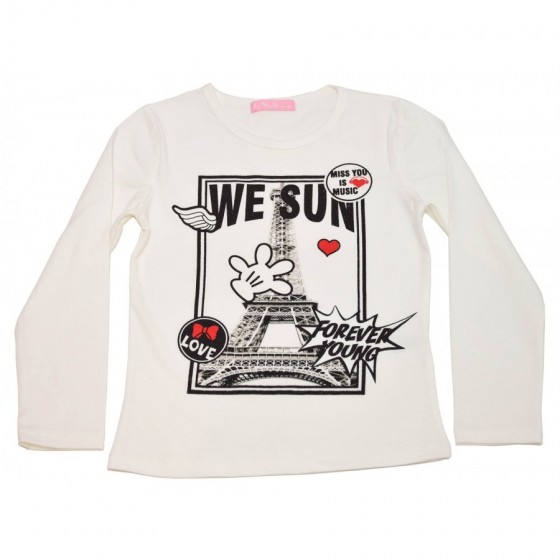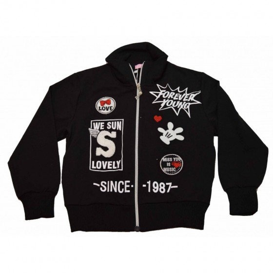 Детски комплект за момиче от три части. Суитшърта е в черно с надписи без качулка. Блузата е в екрю с апликация. Долнището е в...