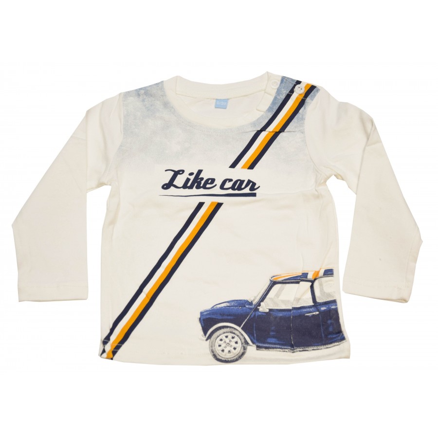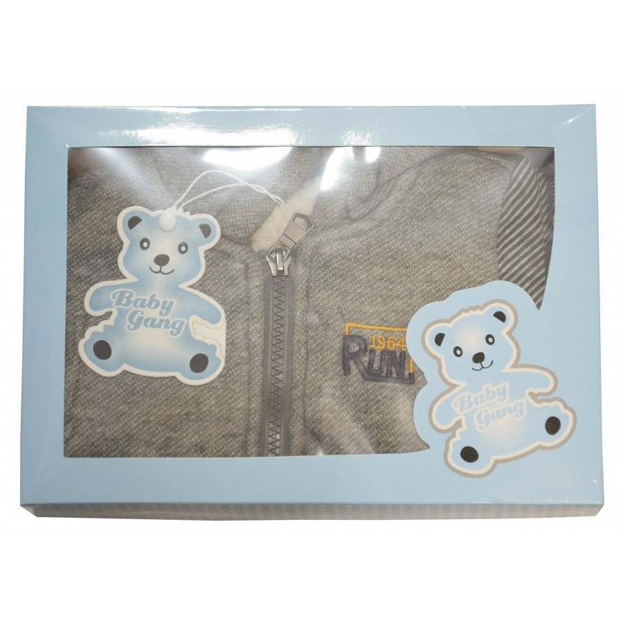 Бебешки комплект от три части за момче. Суитшърта е в сиво с подплата. Блузата е в екрю с апликация. Панталона е в жълто с лека подплата. Комплекта е опакован в кутия.