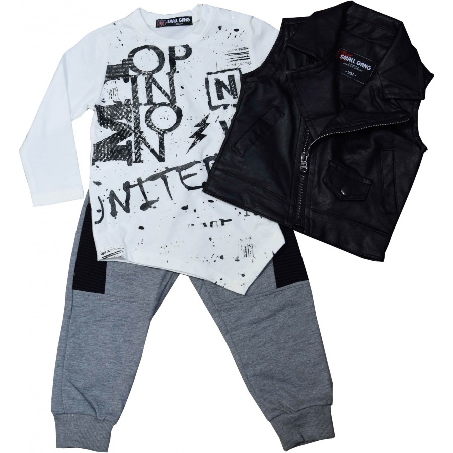 Комплект от три части: блуза в екрю, долнище в сиво и черен кожен елек. Състав: блуза- 60% полиестер, 35% памук, 5% еластан; долнище - 60% полиестер, 35% памук, 5% еластан; елек - 50% памук, 50% полиуретан.