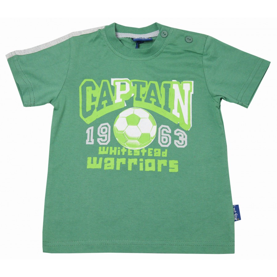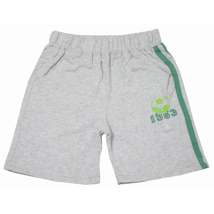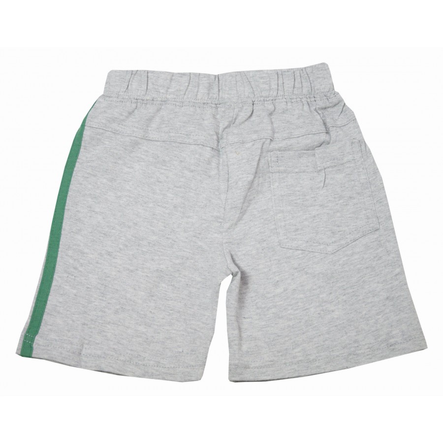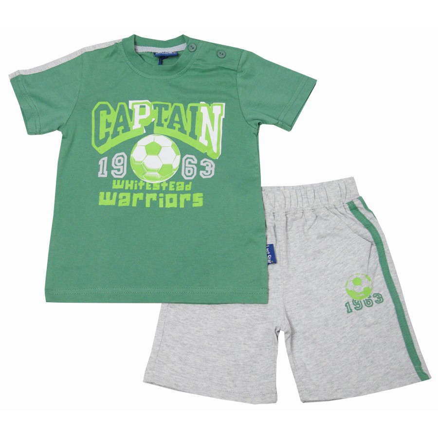 Бебешки комплект за момче от две части със зелена тениска и къси сиви панталони.