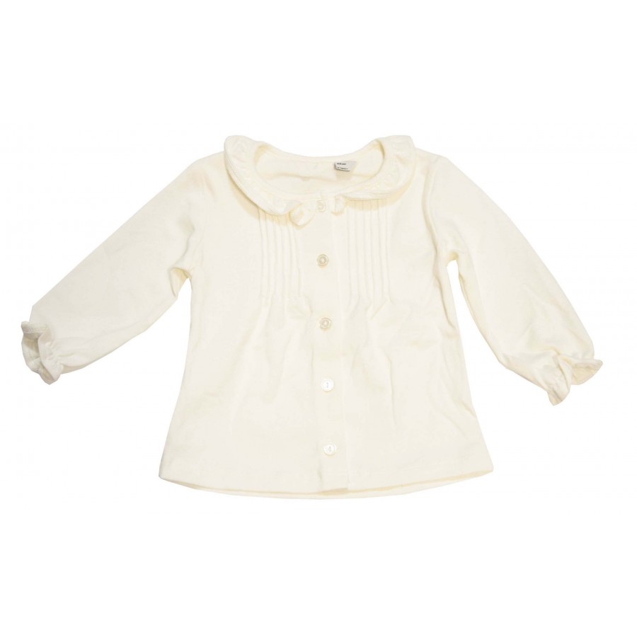 Стилна бебешка блуза за момиче в екрю с предно закопчаване, яка и ластик на ръкавите. Модела е изработен от висококачествена памучна материя. Подходяща е за съчетаване с панталони, дънки или клинове. Блузата е удобна и лесна за обличане, подходяща за ежедневието и за специални поводи.