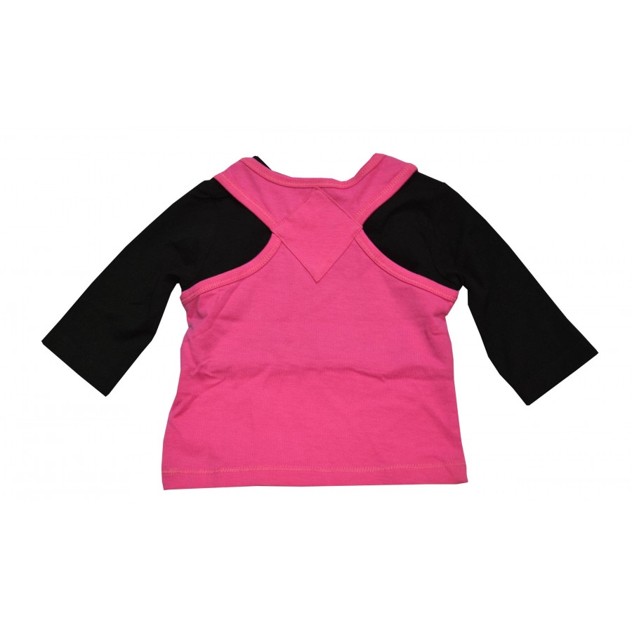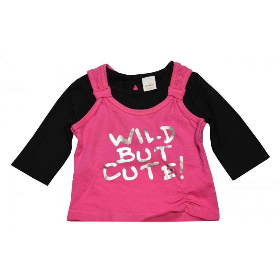 Красива бебешка блуза за момиче в цикламено и черно със закачлив надпис в сребристо. Модела е изработен от висококачествена памучна материя. Блузата е с класическа кройка, обло бие и дълги ръкави. Лесно може да бъде съчетана с дънки, панталони или поли. Подходяща за ежедневието на Вашето малко момиченце.