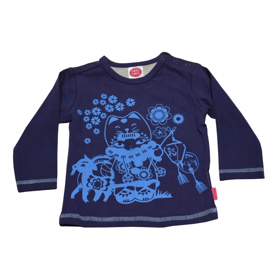 Бебешка блуза за момиче в тъмносиньо с апликация коте. Модела е от мека и плътна материя с класическа кройка, обло бие и дълги ръкави. Малките размери имат копчета на рамото, за лесно обличане и събличане. Подходяща е за ежедневно обличане, съчетана с дънки или панталони.