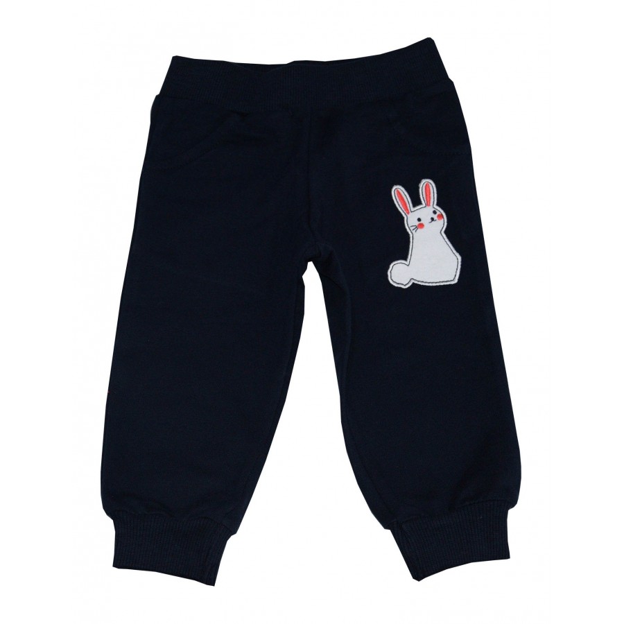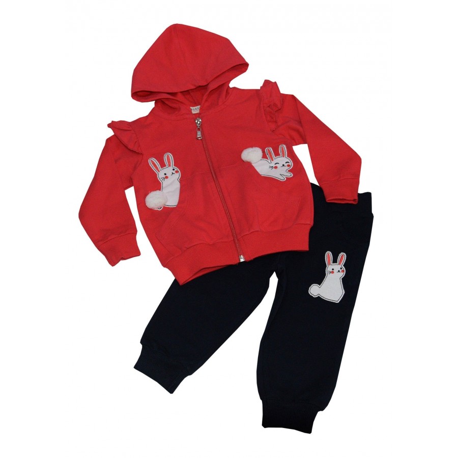 Бебешки комплект за момиче от две части. Суитшърта е в червено с апликация зайчета, долнището е в тъмносиньо.