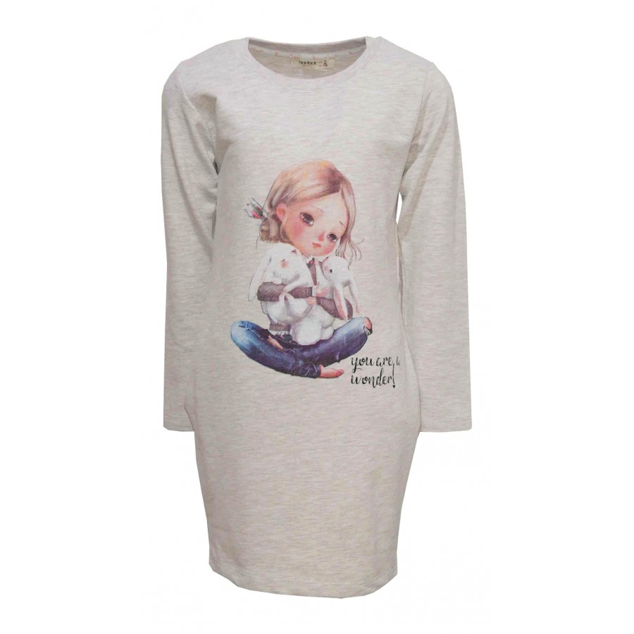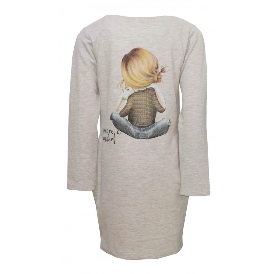 Детска рокля за момиче в бежаво с апликация в предната част и на гърба. Модела е от мека и плътна материя.