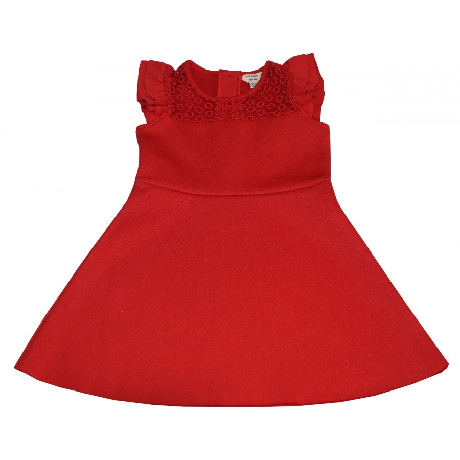 Официална бебешка рокля в червено от неопрен с дантела.