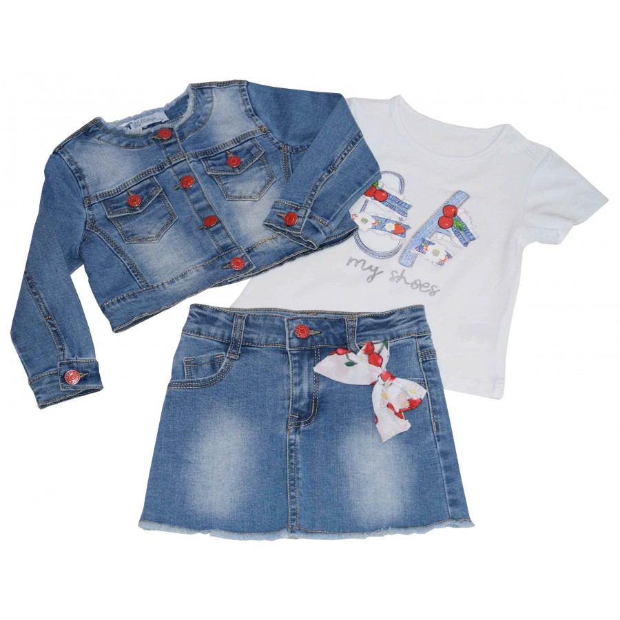 Бебешки комплект за момиче от три части с дънково яке и дънкова пола. Якето е къс модел. Тениската е в бяло с апликация. Полата е с декорация панделка. На талията от вътрешната страна има ластик за корекции.