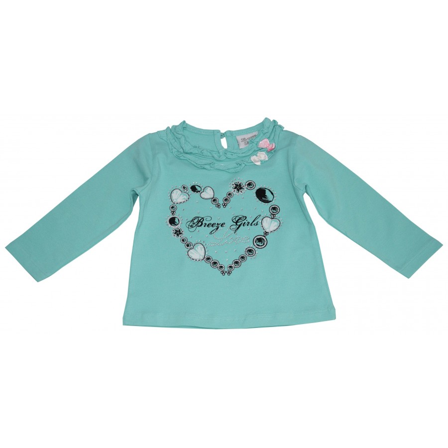 Бебешка блуза за момиче в цвят мента с красива апликация сърце в предната част. Модела е с класическа кройка, обло бие и дълги ръкави. В горната част около деколтето има къдрици с малки панделки и копче на врата, за лесно обличане и събличане. Съчетава се лесно с дънки, панталони или поли.