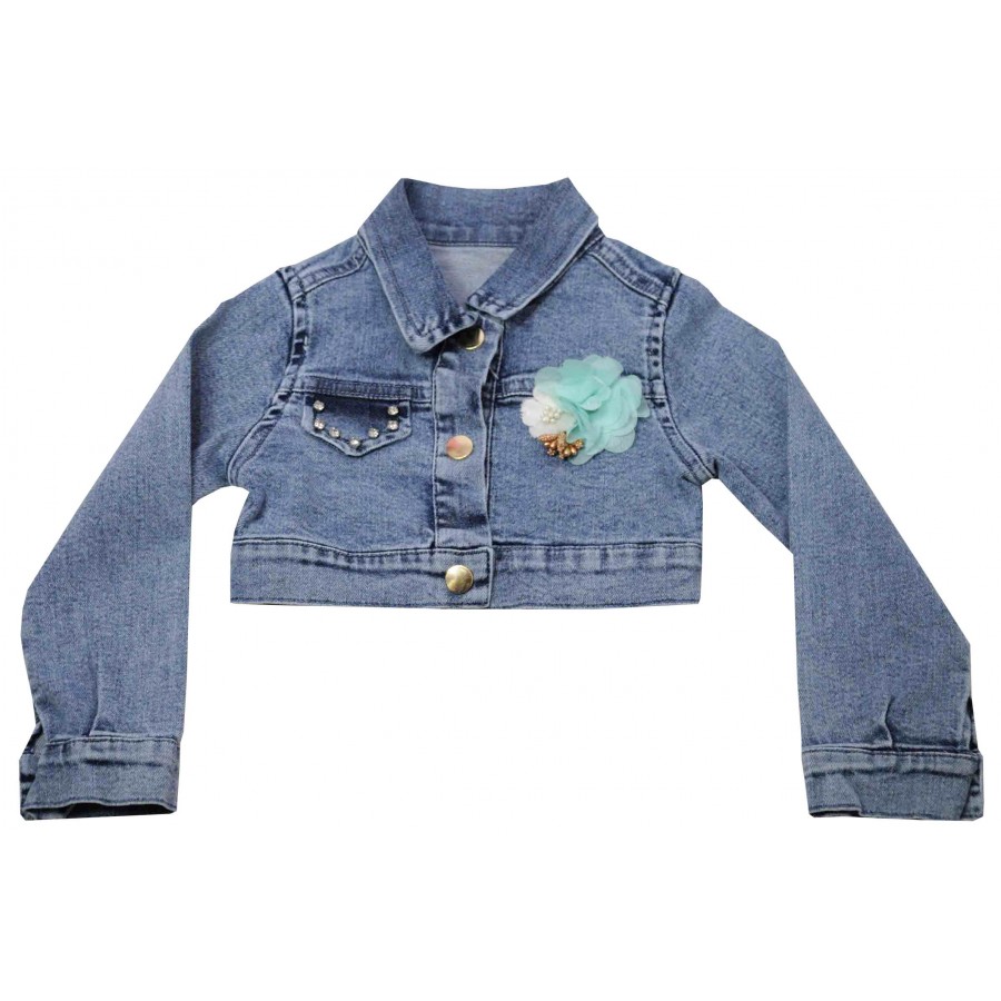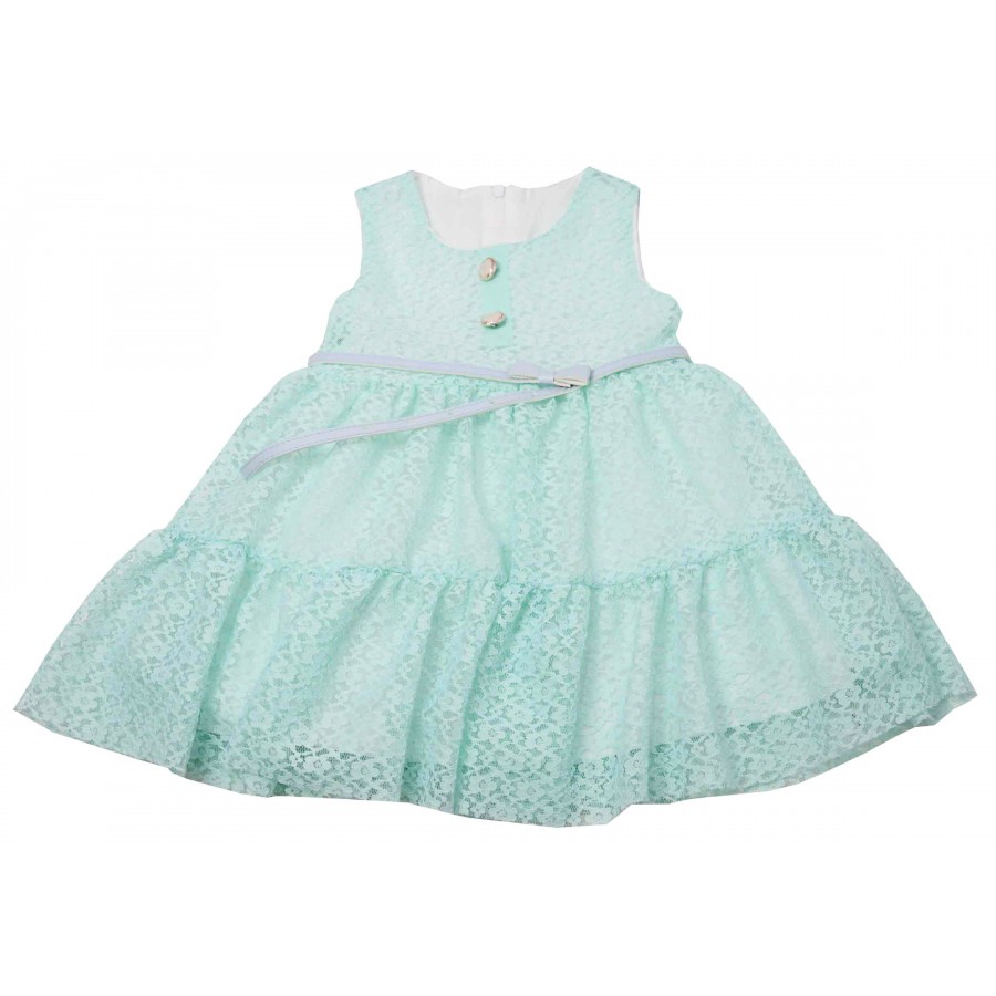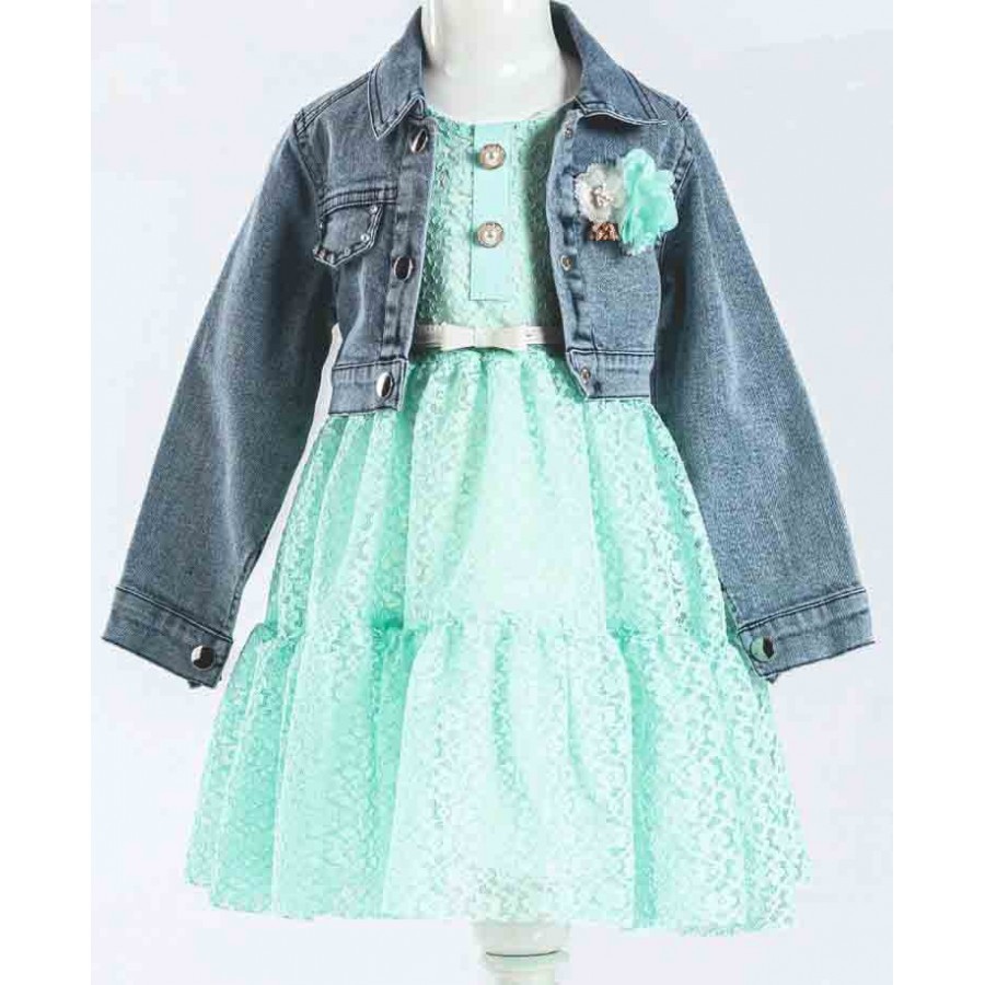 Детски комплект от две части за момиче. Роклята е дантелена в цвят мента зелено с аксесоар колан. Болерото е дънково с цветя.