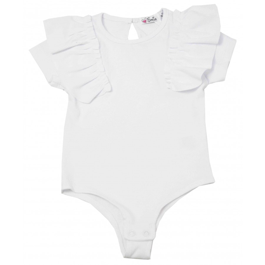 Бебешко боди за момиче в бяло с къдрици на ръкавите. Модела е от еластична материя рипс.