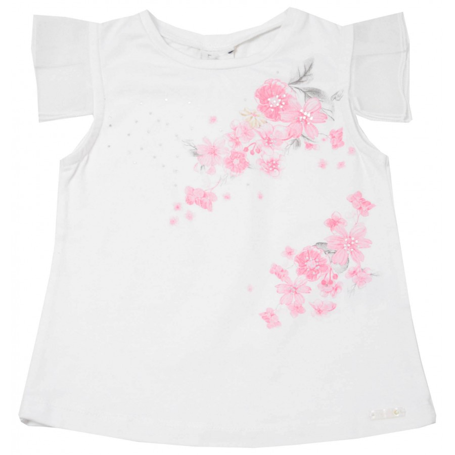Детска тениска за момиче в бяло с апликация цветя и тюл на ръкавите.