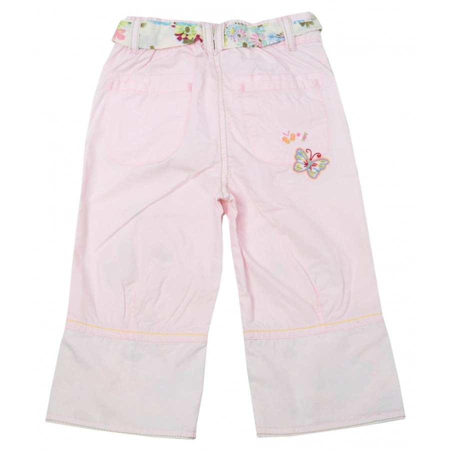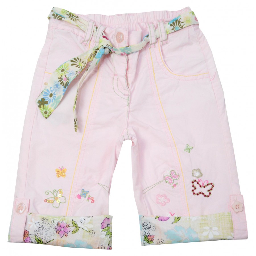 Бебешки пролетен панталон за момиче в розово с цветни бродирани пеперуди. Модела има възможност да се регулира на дължина.