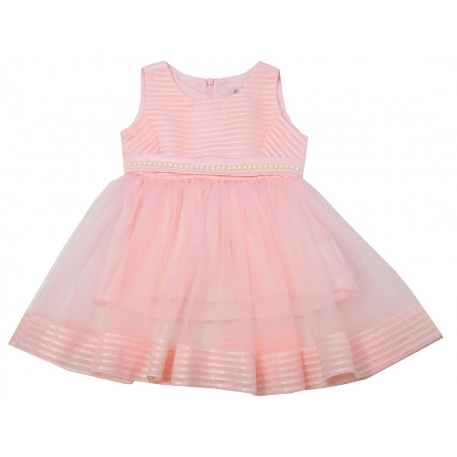 Официална бебешка рокля в розово с перли на талията. Горната част е от сатен с цип на гърба, долната част е от тюл.