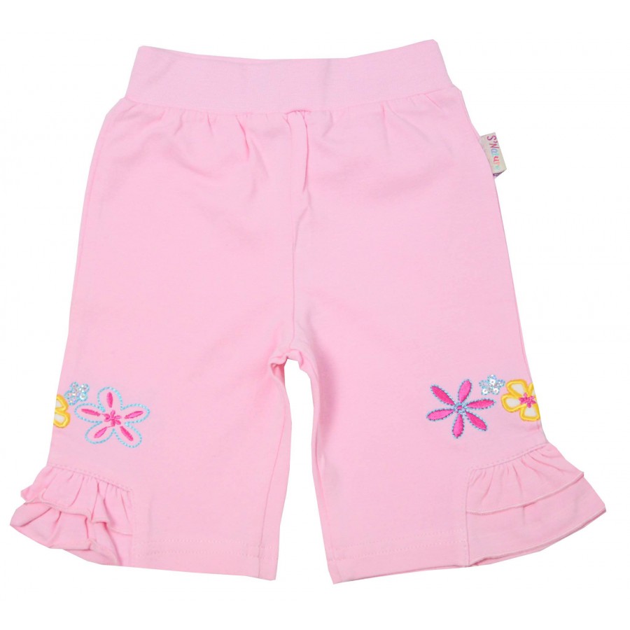 Бебешки къси панталони за момиче в розово с бродерия цветя. Модела е с дължина под коляното.