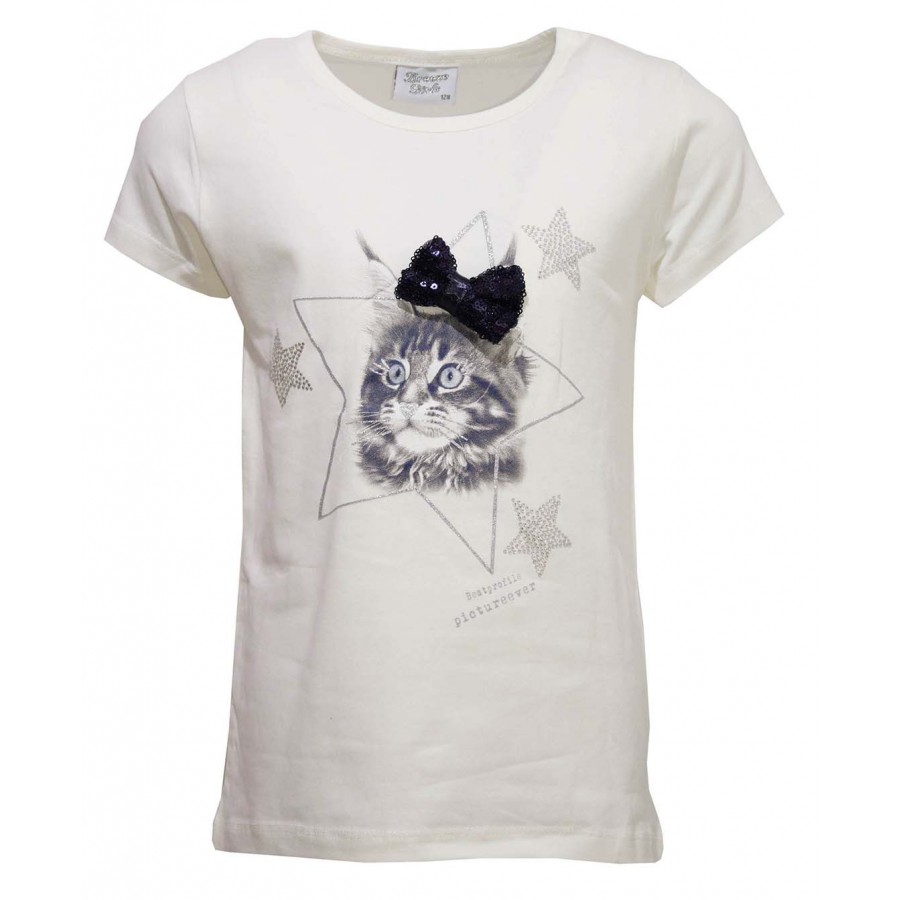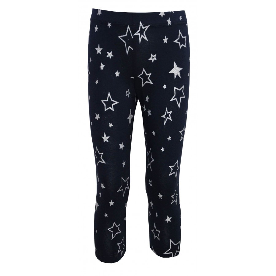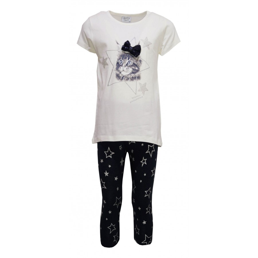 Детски комплект за момиче от две части туника и клин. Тениската е в екрю с красива апликация. Клина е в тъмносиньо на сребърни звезди.