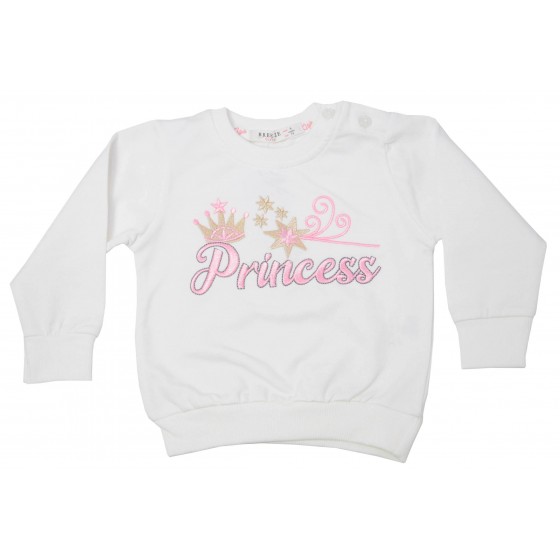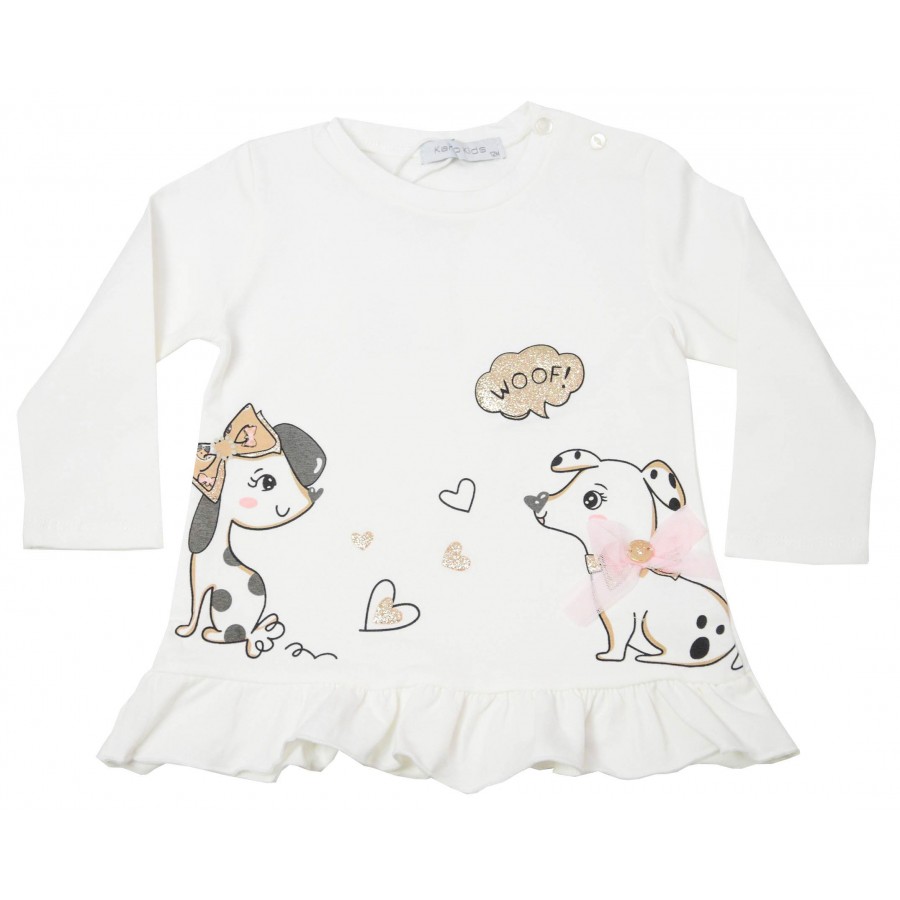 Бебешки комплект за момиче от две части с туника и клин. Туниката е в екрю с красива апликация и къдрици в долната част. Клина е в бежово с цветен принт на кученца. Модела е леко ватиран.