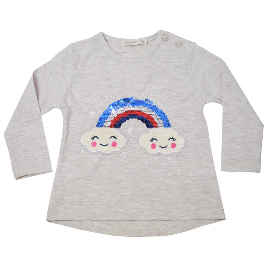 Бебешки комплект за момиче от две части. Блузата е в бежово с красива апликация. Клина е в тъмносиньо с апликация облаче.