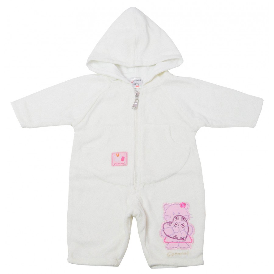Бебешко боди ромпър за момиче от фин плюш в екрю. Модела е с предно закопчаване с цип и качулка.