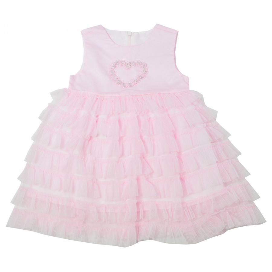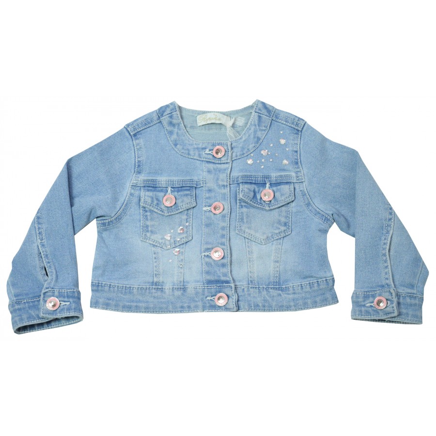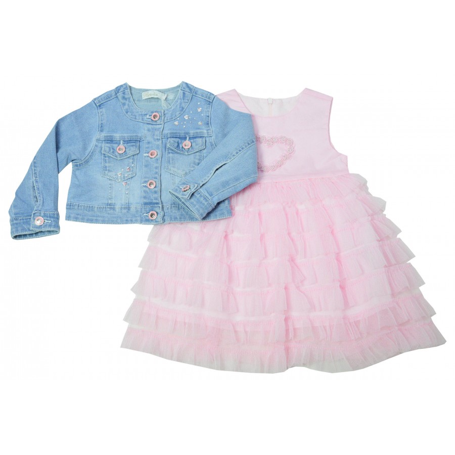 Красив бебешки комплект за момиче от две части, изработен от висококачествени материи. Якето е дънково с дълги ръкави и закопчаване с копчета. Роклята е в розов цвят с обло бие, без ръкави, тюл на волани и цип на гърба за лесно обличане и събличане. Комплекта е подходящ, както за официални поводи, така и за ежедневието.
