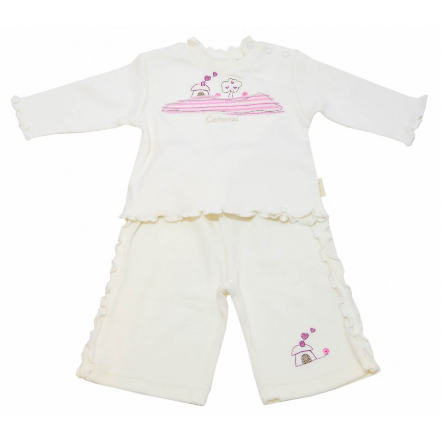 Бебешки комплект за момиче в екрю от две части с блуза с красива апликация и плюшен панталон.