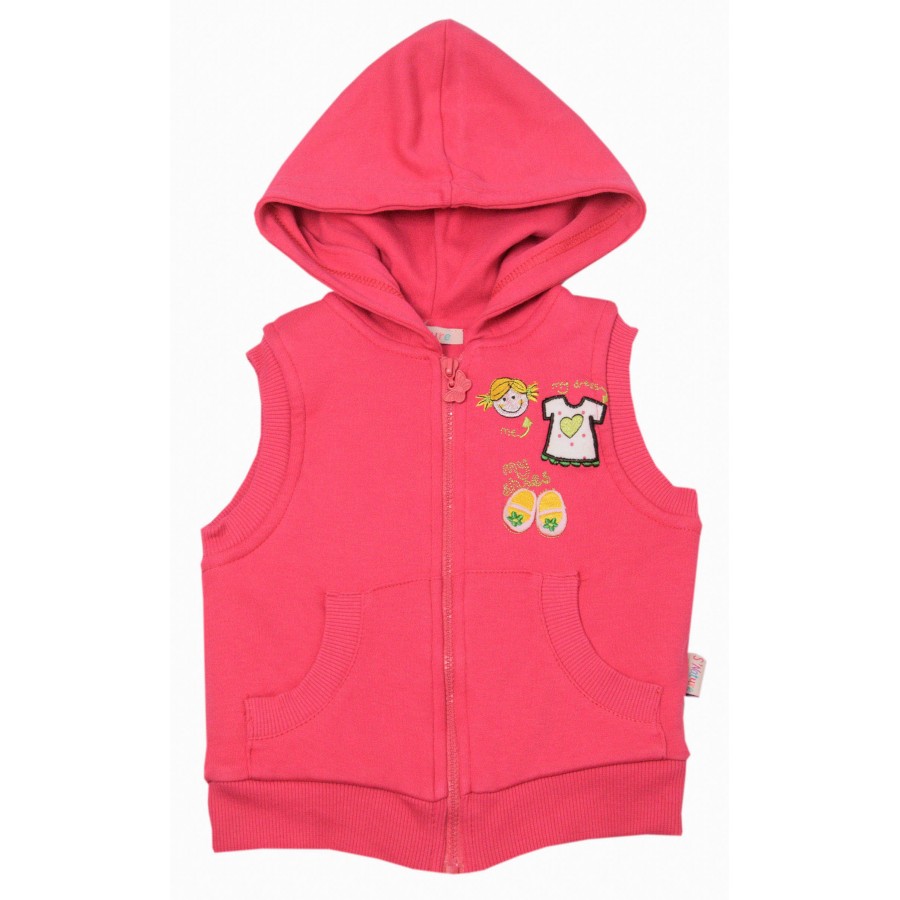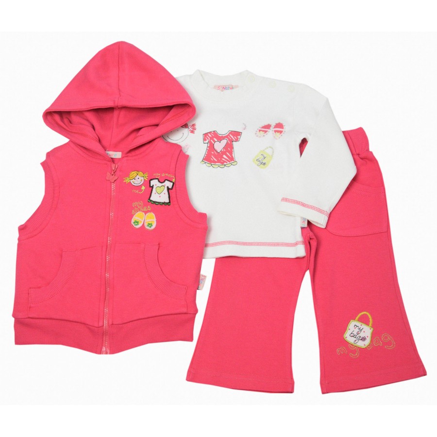 Практичен бебешки комплект за момиче от три части с елек, блуза и долнище. Модела е изработен от висококачествена материя. Елека е без ръкави, с качулка, цип по цялата дължина за лесно обличане и събличане и красива апликация. Блузата е с класическа кройка, обло бие, дълги ръкави и апликация. Долнището е с ластична талия и апликация на крачолите. Комплекта осигурява удобство и свобода на движението през целия ден. Подходящ е за ежедневни игри и разходки. Лесен за поддръжка, комплектът може да се пере в пералня без риск от загуба на форма или цвят.
