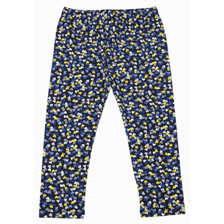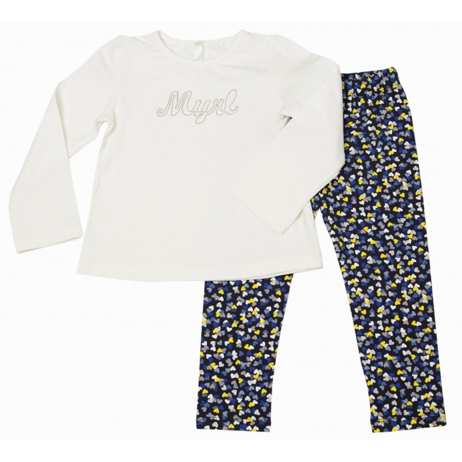Детски комплект за момиче от две части с блуза в екрю и тъмносин клин с принт на сърчица.