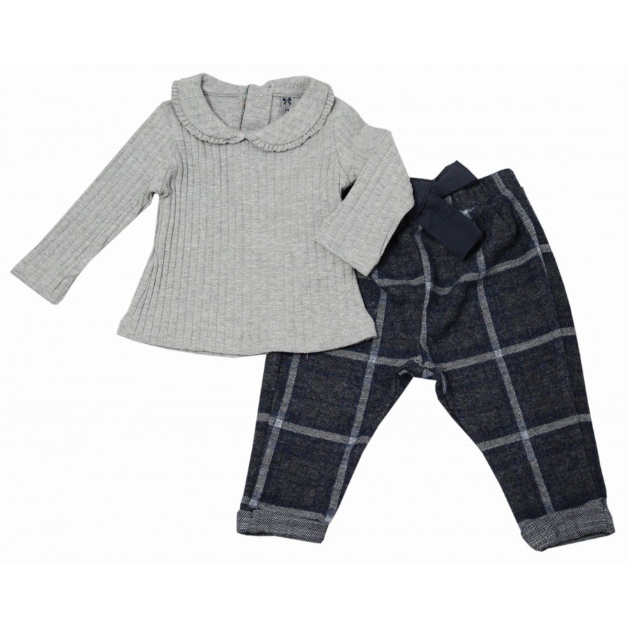 Бебешки комплект за момиче от две части със сива рипсена блуза и каре панталон с панделка.