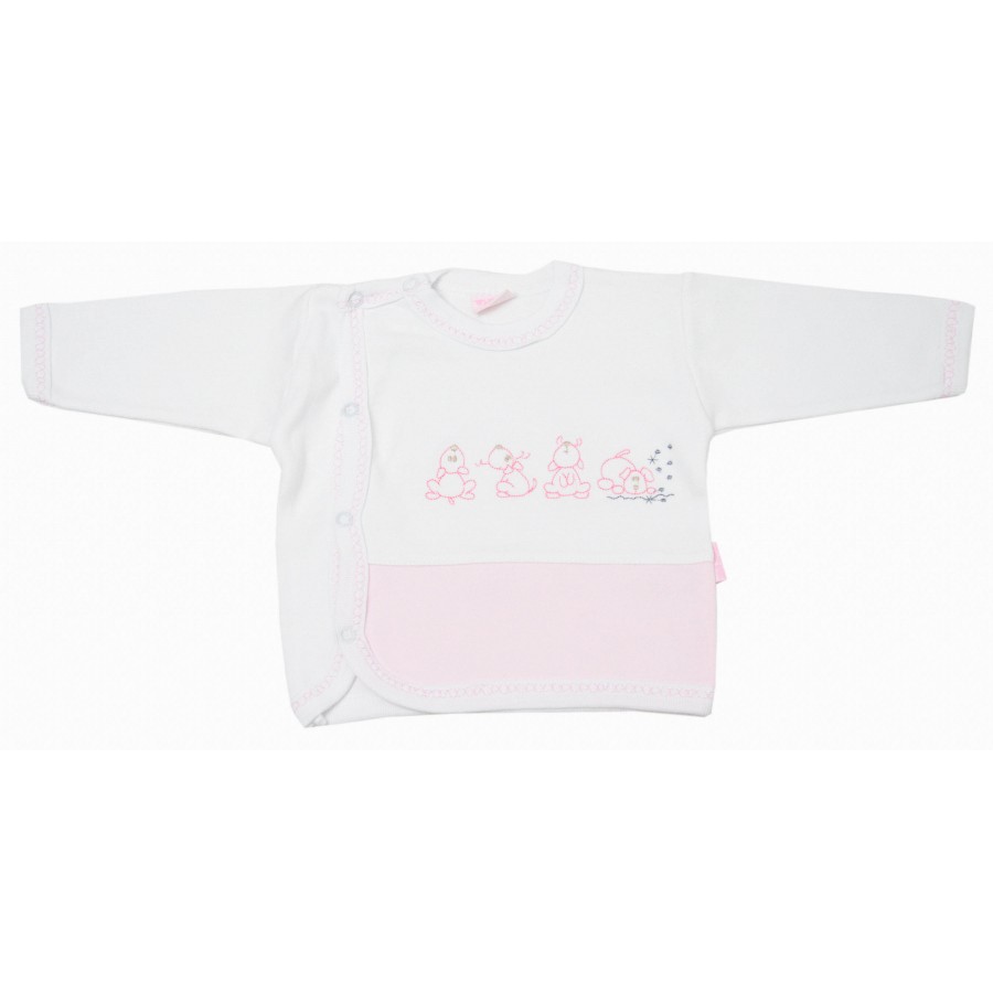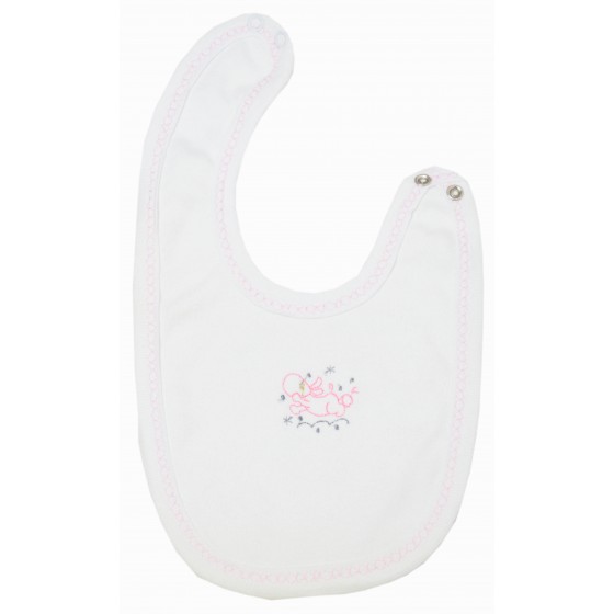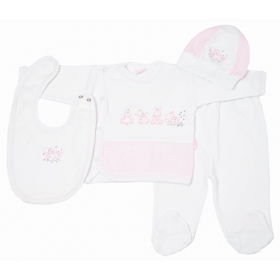Красив и практичен бебешки комплект за момиче от четири части с камизолка, ританки, шапка и лигавник. Модела е изработен от висококачествена памучна материя. Камизолката е с дълги ръкави и красива апликация. Ританките са изчистени с ластична талия. Шапката и лигавника са в бяло и розово с малки апликации. Комплекта осигурява удобство и свобода на движението през целия ден.