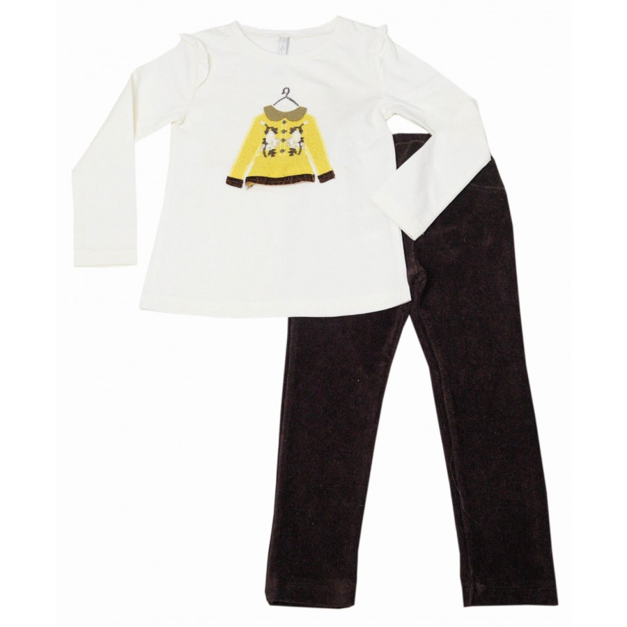 Красив детски комплект за момиче от две части с блуза и клин. Модела е изработен от висококачествена материя. Блузата е в цвят екрю, обло бие, дълги ръкави и красива апликация. Клина е в кафяв цвят от фино плюшено кадифе с джобове. Комплекта осигурява удобство и свобода на движението през целия ден. Лесен за поддръжка, комплектът може да се пере в пералня без риск от загуба на форма или цвят.
