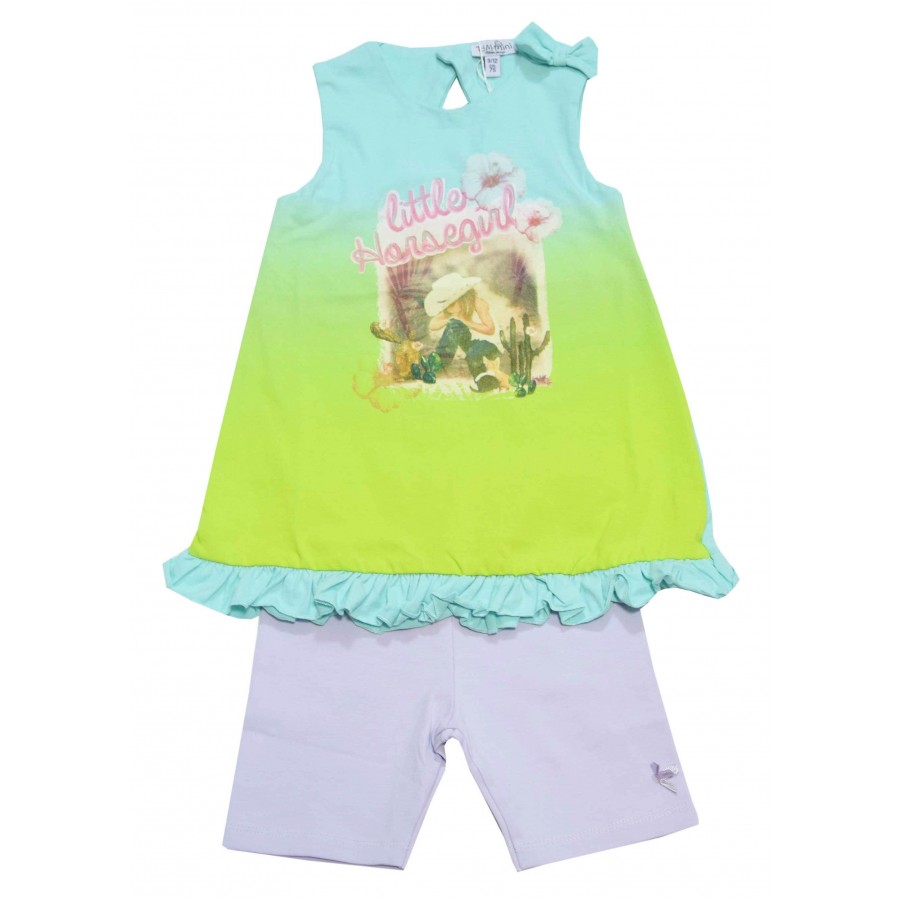 Комплект от две части: туника в преливащи цветове и къс клин в бледо лилаво. Състав: