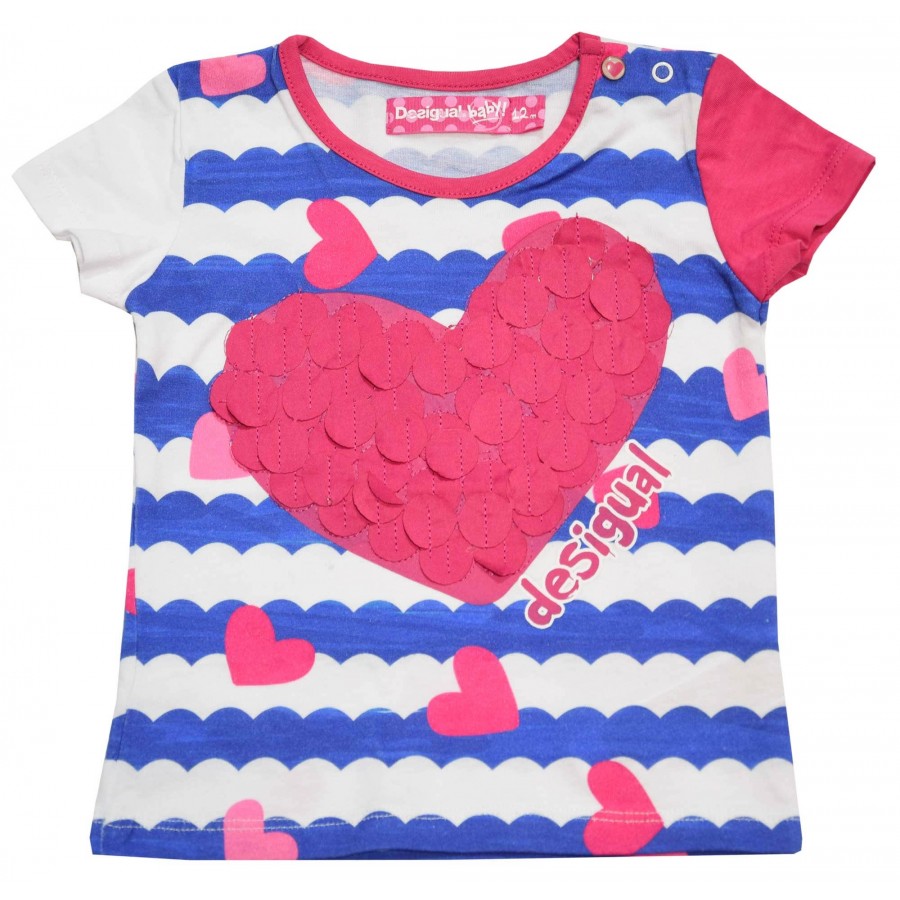 Тениска райе синьо и бяло с цикламено сърце. Състав: 100% памук.