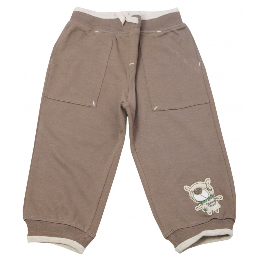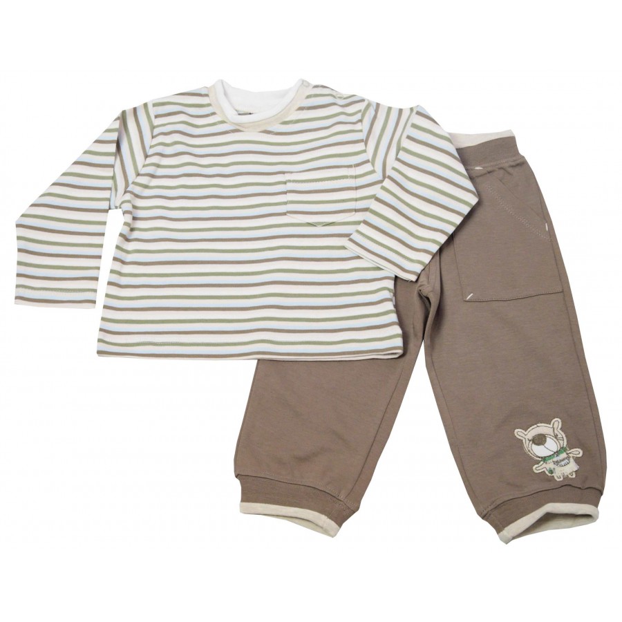 Бебешки комплект за момче, изработен от висококачествена памучна материя. Блузата е раирана с дълъг ръкав, обло бие и копчета на рамото за лесно обличане и събличане. Долнището е в кафяво с апликация мече на левия крачол. Модела е с ластик на талията и глезените. Подходящ е за ежедневието на Вашето момче.