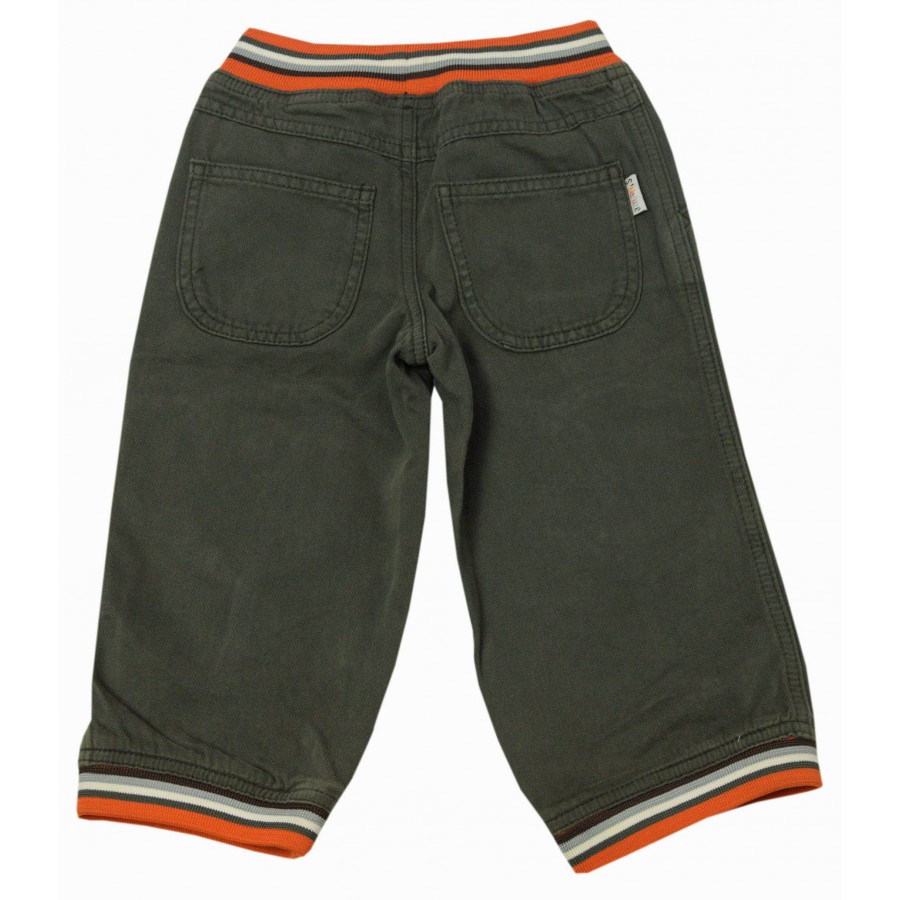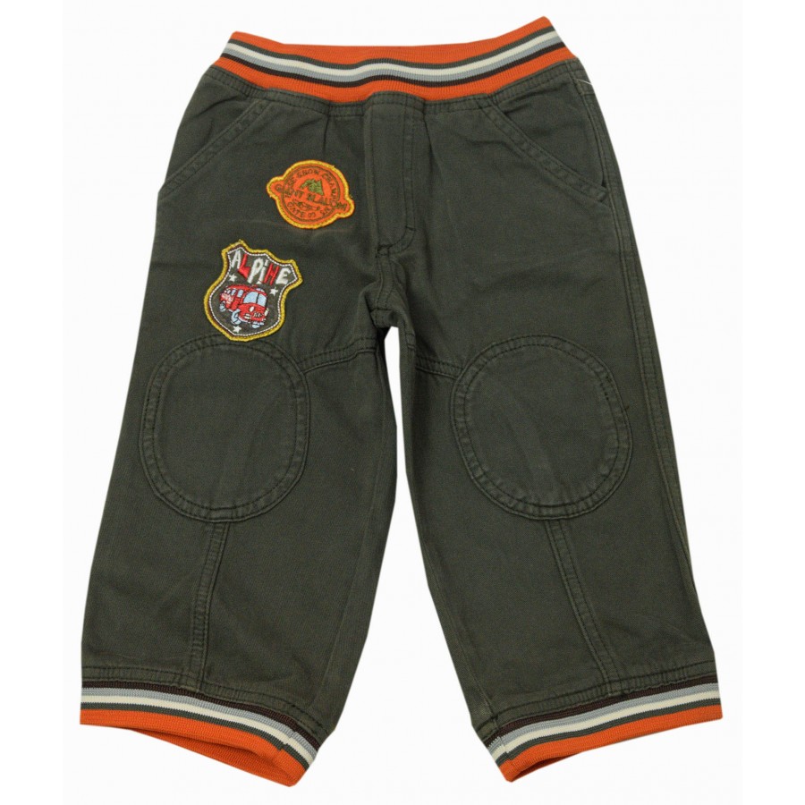 Красиви бебешки панталони за момче, изработени от висококачествена памучна материя. Модела е в масленозелен цвят с кръпки на коленете, оранжев ластик на талията и на глезените и апликация емблеми на десния крачол. Панталоните имат джобове отпред и на гърба. Подходящи са за ежедневни игри и разходки през сезоните есен и зима. Лесно се съчетават с блузи, ризи, пуловери и суитшърти. Панталоните могат да се перат в пералня без риск от загуба на форма или цвят.