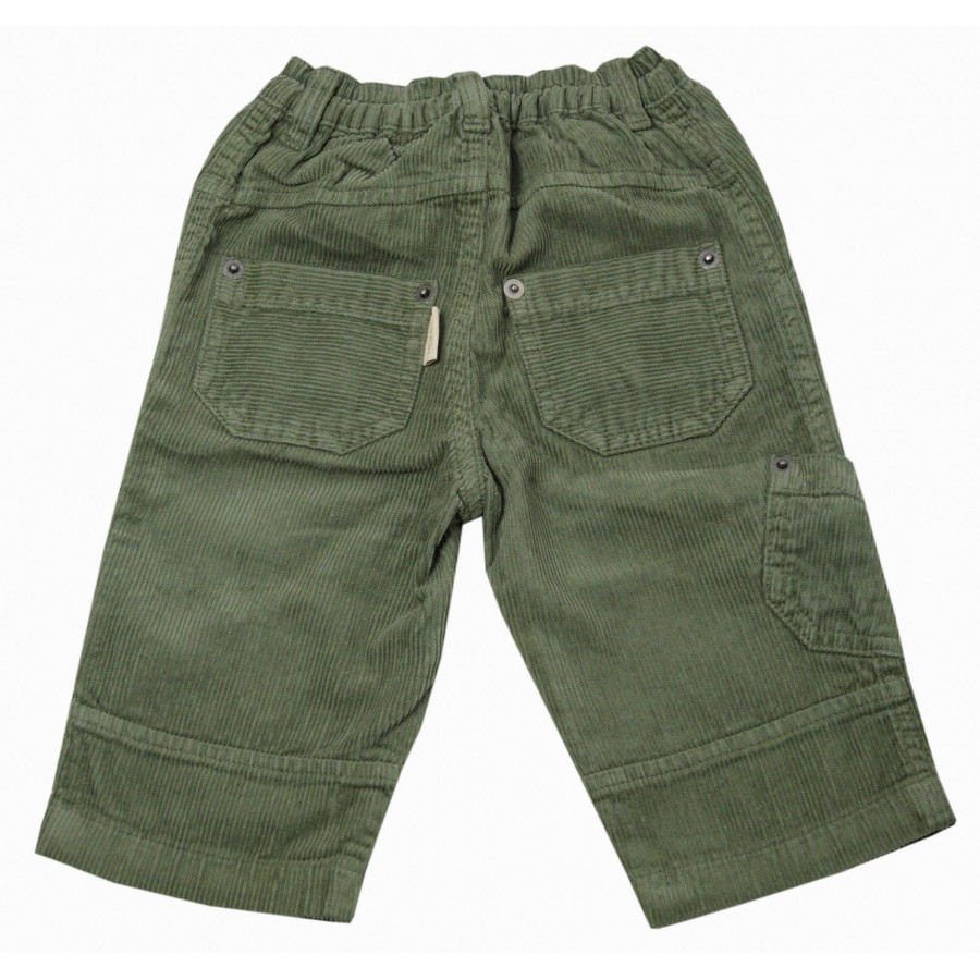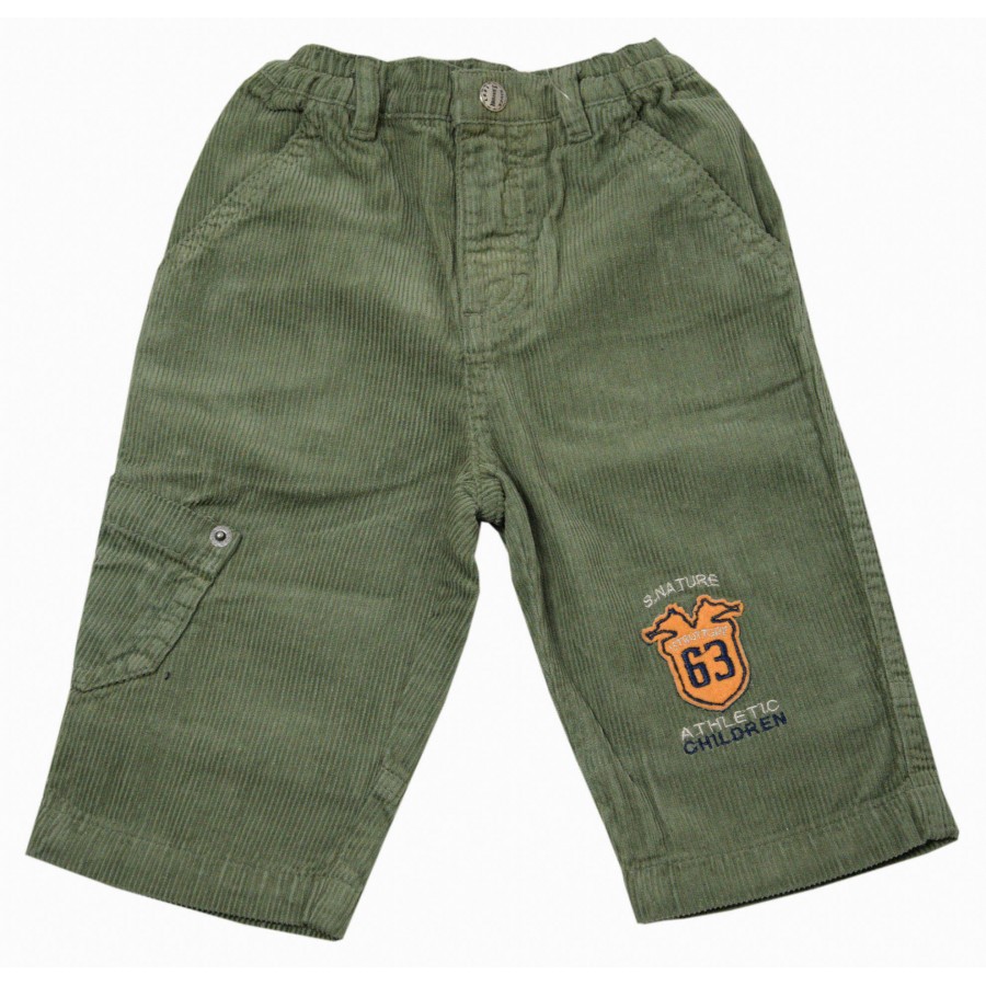 Красиви бебешки панталони за момче, изработени от висококачествена материя. Модела е от рипсено кадифе в масленозелен цвят с ластична талия и апликация на левия крачол. Панталоните имат джобове отпред и на гърба. Подходящи са за ежедневни игри и разходки през сезоните есен и зима. Лесно се съчетават с блузи, ризи, пуловери и суитшърти. Панталоните могат да се перат в пералня без риск от загуба на форма или цвят.