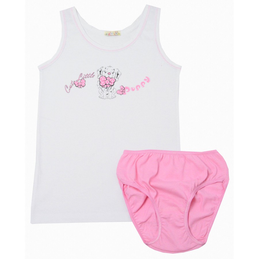 Детски комплект бельо за момиче с потник в бяло с апликация кученце и розови бикини.