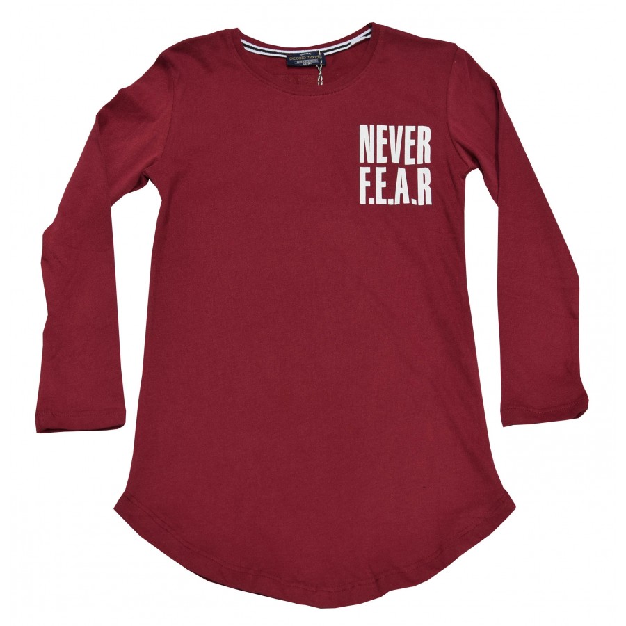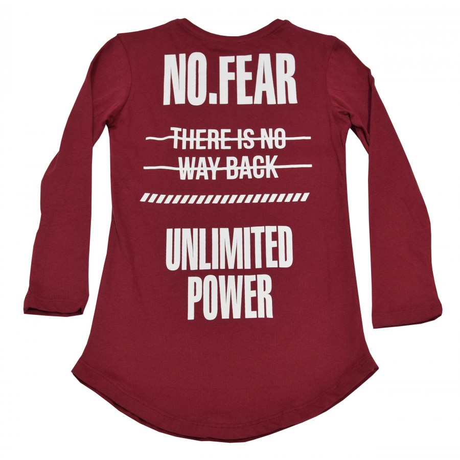 Детска блуза за момче в червено с надписи на гърба. Модела е удължен от мека материя.