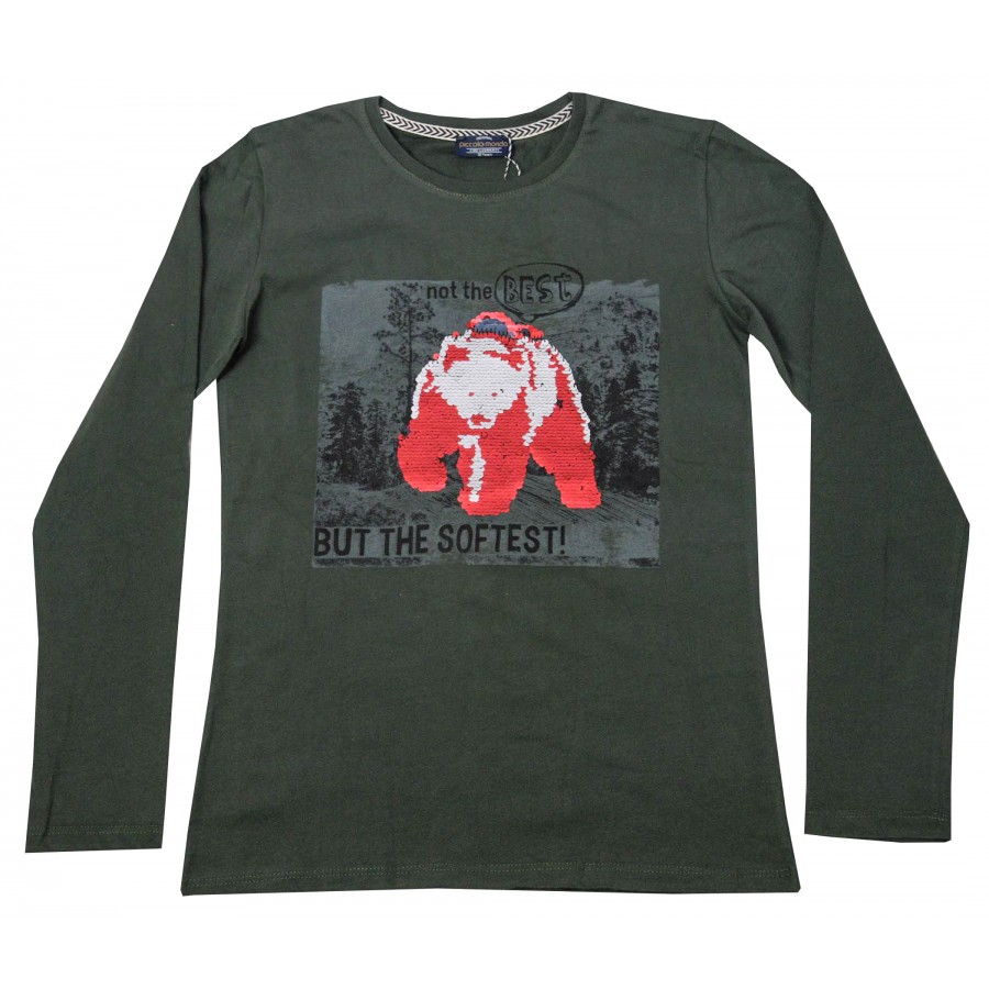 Детска блуза за момче в масленозелено с апликация мечка от обръщащи се пайети.