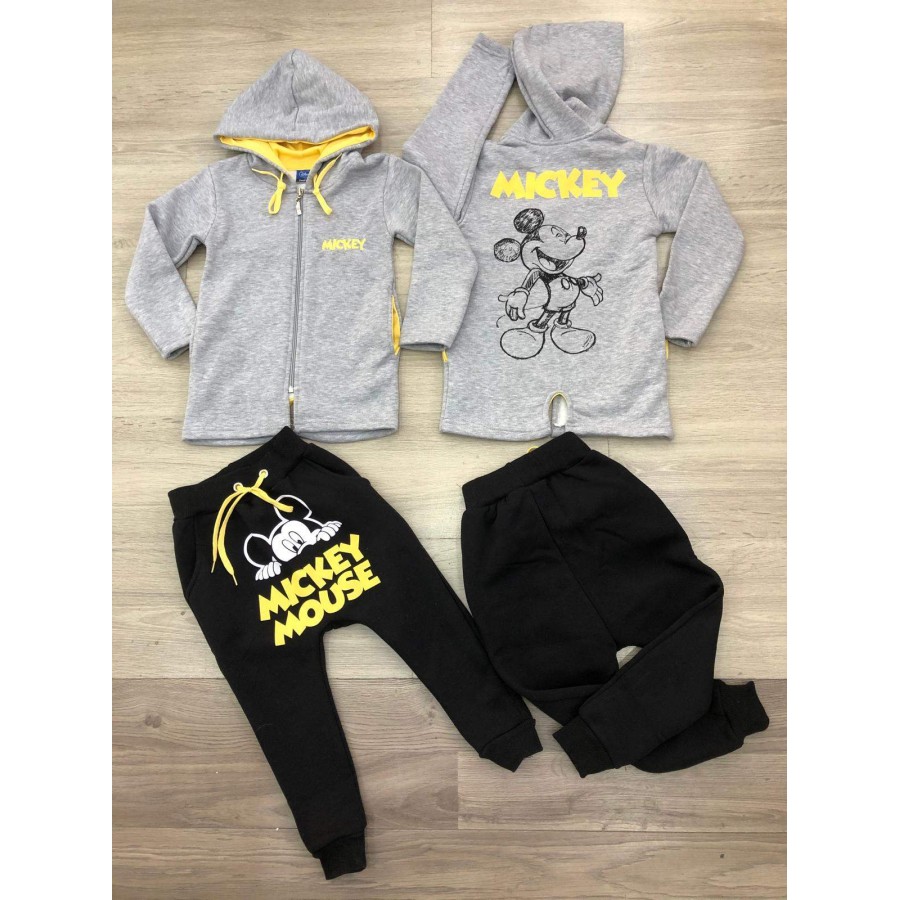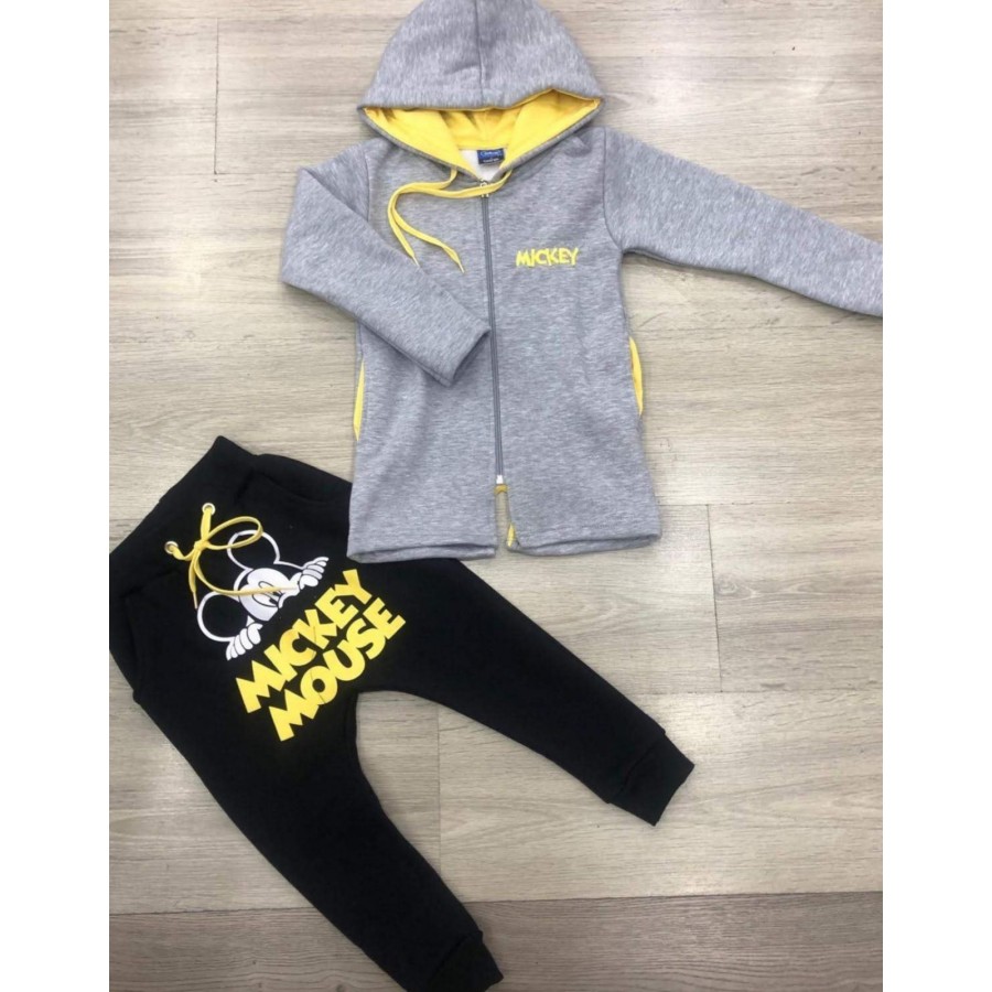 Детски ватиран комплект за момче от две части. Модела на суитшърта е удължен в сиво с надпис в предната част и красива апликация на гърба. Долнището е в черно тип потур с апликация в предната част.