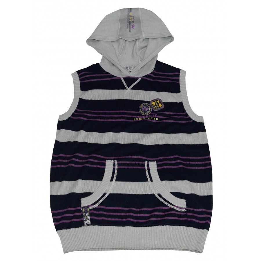 Детски пуловер без ръкави за момче в райе с качулка.