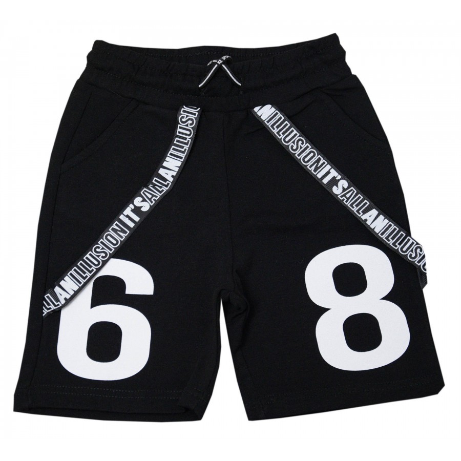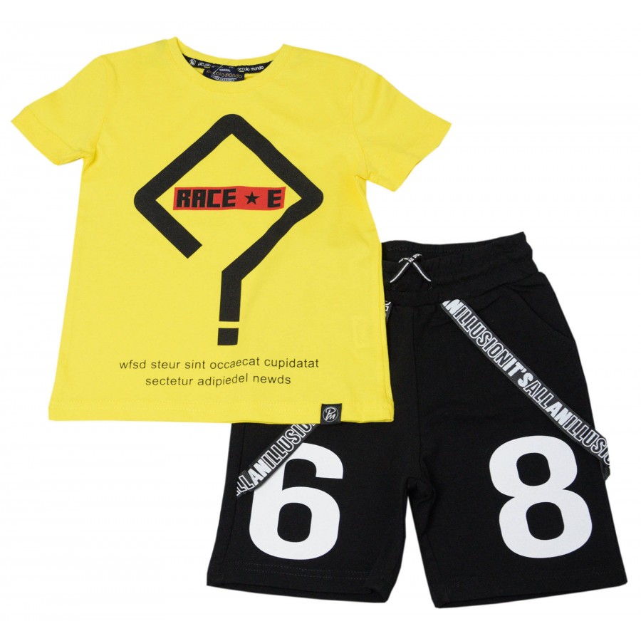 Детски комплект за момче от две части. Тениската е в жълто с апликация надписи. Късите панталони са в черно с бели надписи.